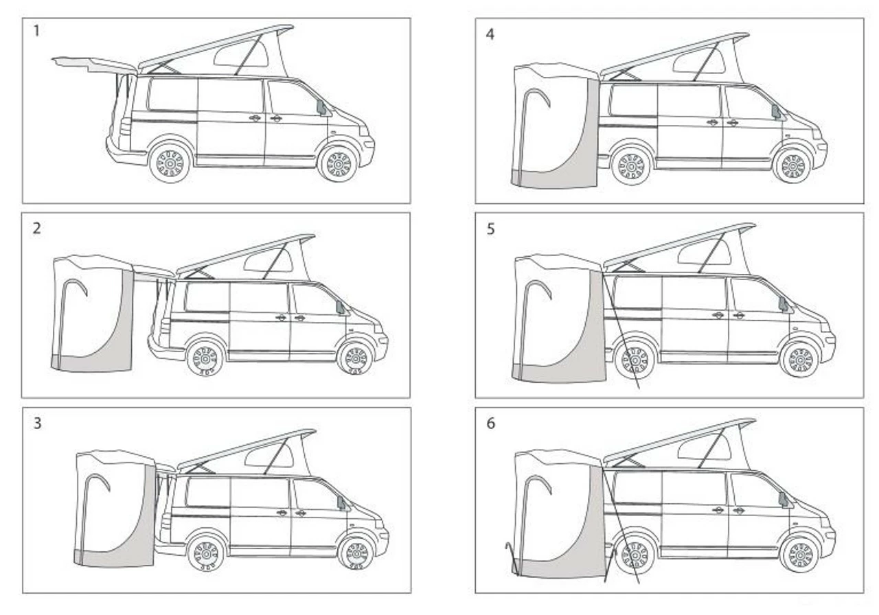 Reimo’s handy tailgate tent fits VW campervans like a glove. This tailgate awning lets you extend your van’s living space, giving you a compact profile on the road, and plenty of space when pitched up.